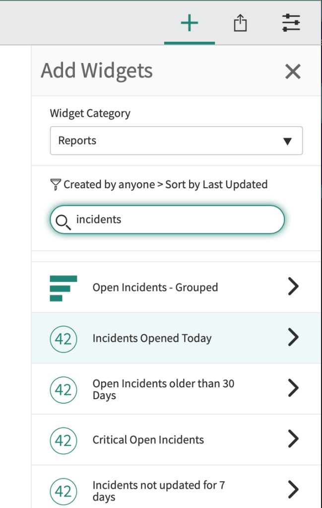 Click the + icon to show the Add Widgets panel. In Widget Category, choose Reports, and then search for the reports you want to add