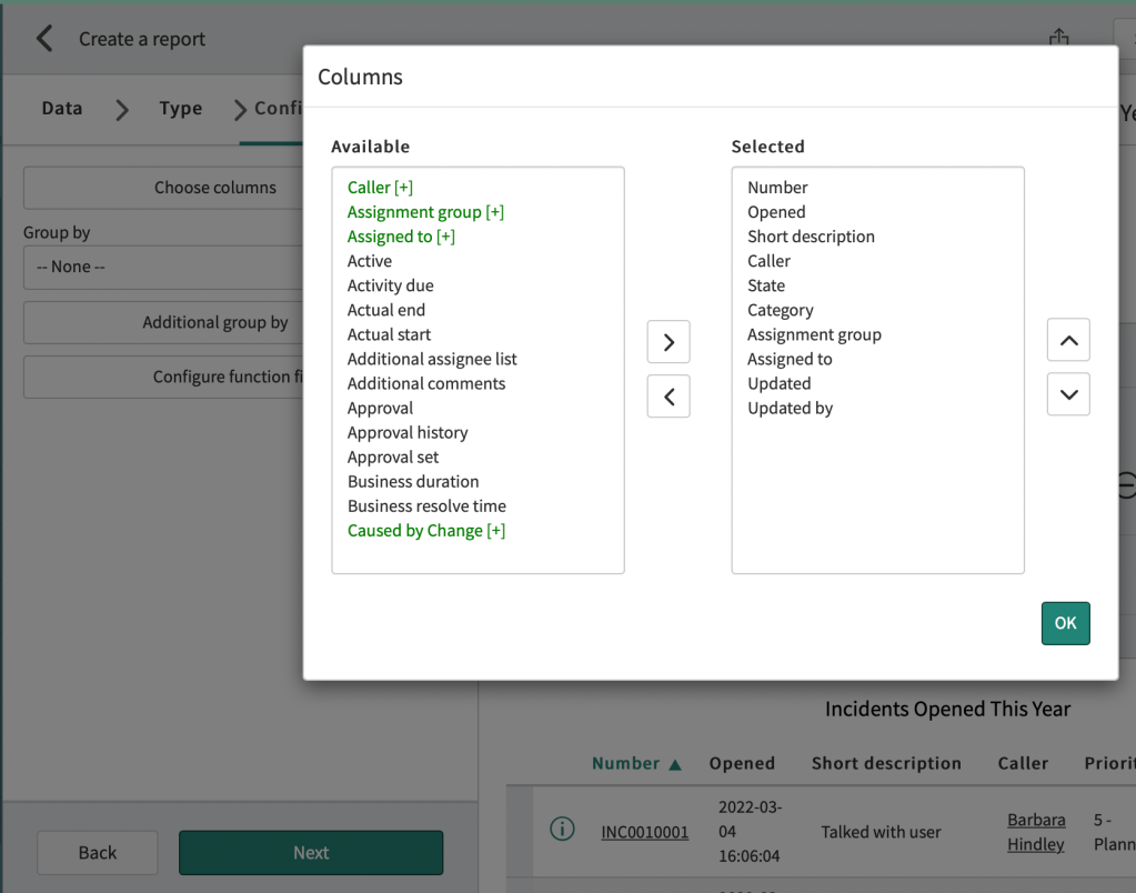 Next, go into the Configure Tab and click Choose columns to select which fields to display in the report