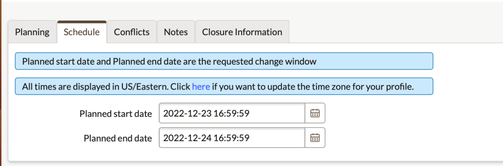 All times are displayed in ${gs.getSession().getTimeZoneName()}. Click <a href="/nav_to.do?uri=sys_user.do?sys_id=${gs.getUserID()}%26sysparm_view=ess">here</a> if you want to update the time zone for your profile.
