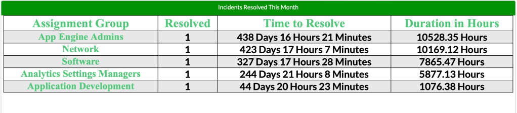 Format had to be Assignment Group, Number of Incidents Resolved, Average Duration, and Average Duration in Hours.