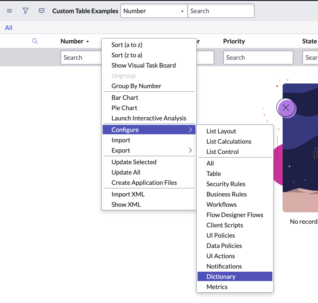 1. Go to your custom table, right-click the header -> Configure -> Dictionary