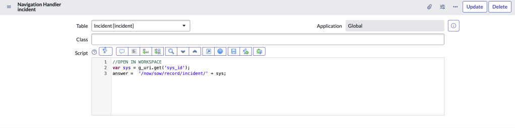 Sample Navigation Handler (proof of concept), to automatically open/redirect Incidents to open in Workspace. If a technician clicks on an Incident from a dashboard or classic list view, the Incident will still open in SOW Workspace.