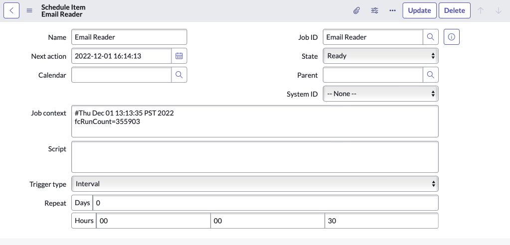 The “Email Reader” scheduled job controls the frequently in which received emails are processed on your ServiceNow instance.