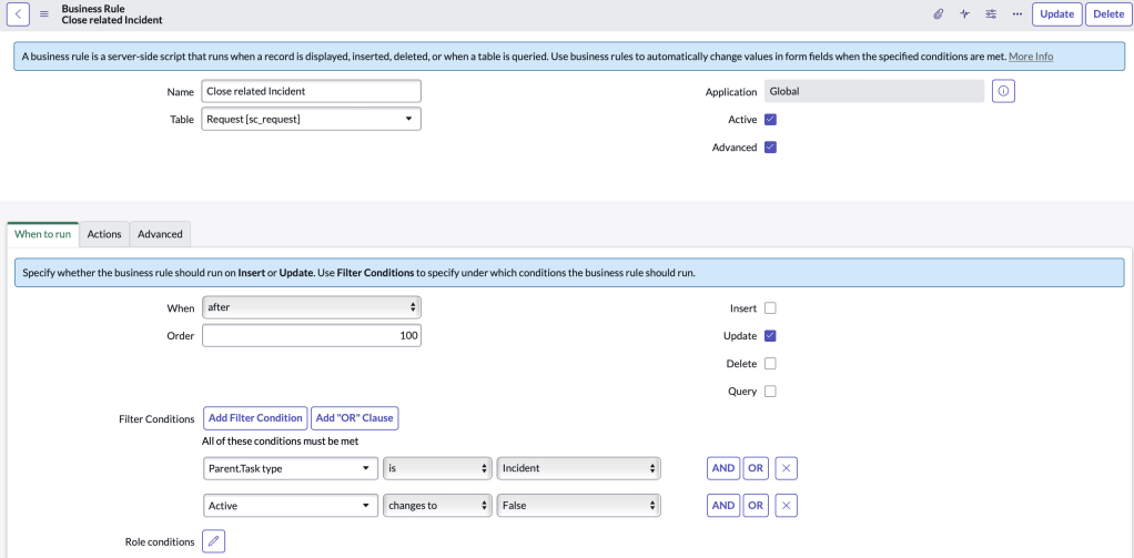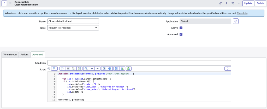 Example business rule to automatically close the related (parent) Incident when a Request is closed.