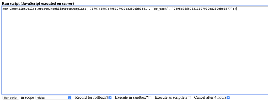 For reference, checklist templates are stored in this table [checklist_template]. You’ll need to go here to get the sys_id of the template so you can use it in the first parameter of the script