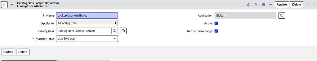 Previously you would’ve had to create a client callable script include and use GlideAJAX in a client script to retrieve the values and populate the variables. But with Catalog Data Lookup Definitions, it is much simpler.